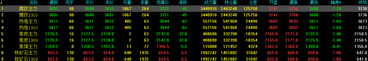 13日螺紋1910收3691跌45,供強需弱的趨勢明顯,預(yù)計期螺續(xù)跌;熱卷1910收3611跌62,鐵礦石收653.5漲6.5